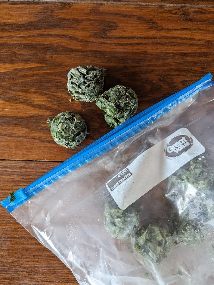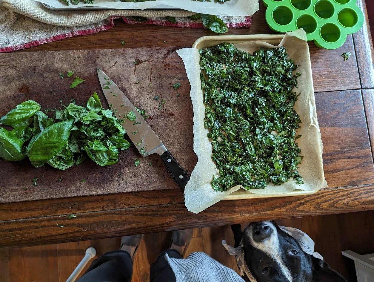 So last year, I figured out I could freeze minced/chopped basil coated liberally in olive oil! I froze them in cubes and then stored them in a bag. It is so easy to pull out nuggets of fresh garden basil for spaghetti and curry all winter long!