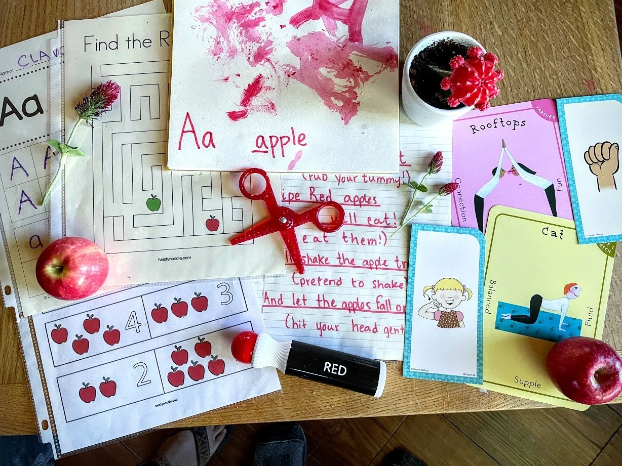 Week 1: Letter “Aa,” the color red, apple projects (apple painting with w/color red and counting with apple slices). Alligator dot activity and “I Spy” outside for things red. Review the Bible story of creation (use the creation wheel to help visual story).